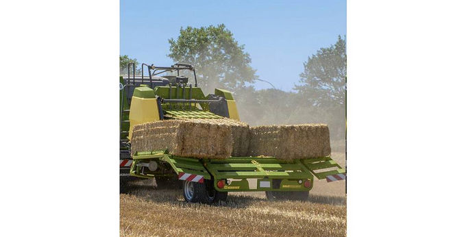 Running behind the baler, the KRONE BaleCollect collects up to three square bales from a 3' 11" wide chamber or up to five bales from a 2' 7.4" chamber. It offers a choice of unloading modes to prepare the bales for the next steps in the field, significantly shortening post-baling loading times, reducing journeys, and minimizing soil compaction.